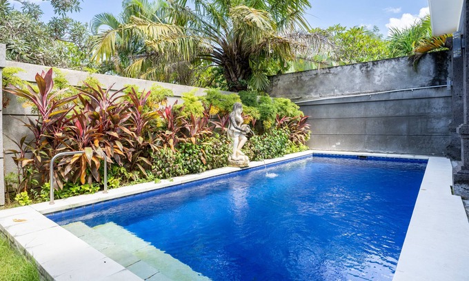 Welcome to our beautiful villa located in the heart of Legian, within a peaceful villa complex resort. Our villa offers a serene atmosphere surrounded by lush greenery, a fish pond, and even ducks swimming around.