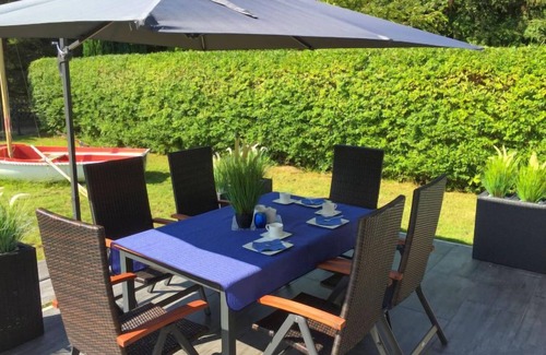 3-room house 80 m2 on 2 levels, on the ground floor. Cosy furnishings: living room 30 m2 with Scandinavian wood stove and satellite TV (flat screen), CD-player and hi-fi system. Exit to the garden, to the terrace. Open kitchen 10 m2 (oven, dishwasher, 4 ceramic glass hob hotplates, microwave, grill, electric coffee machine) with dining table. Shower/WC. Upper floor: (spiral staircase), 2 rooms 18 m2, with sloping ceilings, each room with 1 double bed (180 cm, length 200 cm). Shower/WC. Terrace 20 m2. Terrace furniture, barbecue (portable). Facilities: washing machine, telephone (extra), hair dryer, logs (extra). Internet (WiFi, free). Please note: not suitable for small children. Non-smoking house. Smoke alarm, fire extinguisher.