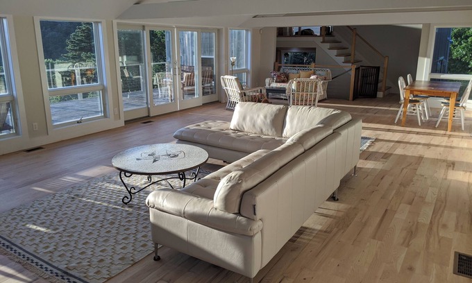 Enjoy sweeping valley views from expansive decks and a vaulted 30-foot Great Room. This 4BR, 2BA home is built for effortless Cape Cod stays: central AC, top-tier Wi‑Fi, gas fireplaces, modern kitchen, two washer/dryers, 75" OLED TV, and a game room with a ping-pong/pool combo table. It’s a short walk to Corn Hill Beach and a quick drive to Provincetown, Wellfleet, and the National Seashore.