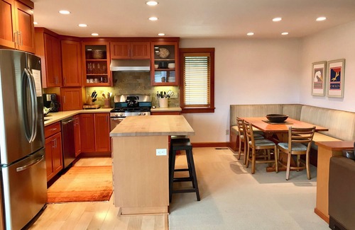 Upstairs, the open floor plan invites a relaxing evening in front of the stoned hearth and gas fireplace, while others can either gather around the dining booth, or prepare meals in a well-stocked and roomy kitchen. The spacious island counter also provides additional bar-stool seating.