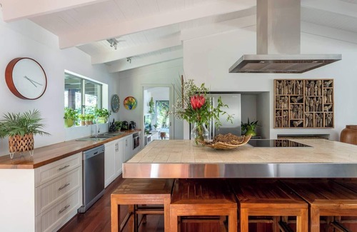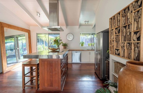 The kitchen is fully equipped with an induction cooktop, dishwasher, and central island for casual dining. Share meals at the large timber table overlooking the pool and native bushland. Outside, the Bali inspiration comes alive—recline on a sunbed beside the sparkling pool, sip wine in the shaded cabana, or dine alfresco at the ten-seater table under open skies. With lush planting and multiple outdoor zones, the space is designed for effortless relaxation and connection.