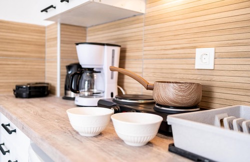 The apartment contains a kitchen incl. a fridge, hob, kettle, coffee machine,