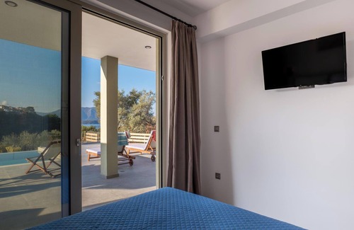 From all of the main rooms, the private swimming pool and adjacent terraces the sweeping views across undulating, olive-tree-clad countryside to sleepy Spartochori, the glittering Ionian Sea, famous island of Skorpios and rolling hills of eastern Lefkada are, quite simply, beautiful.