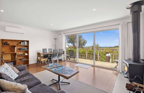 Unlock the gate to access the driveway and parking for this property. There is room for one car in the driveway but there is plenty of free street parking. Walking into the home you will enter into the main living, dining and kitchen area. This area looks out onto the ocean, Aireys Inlet and Anglesea Heath. There is an indoor fireplace and a split system in this area to help keep you warm or cool depending on what time of year you visit. The dining table in this area seats 6 people. There are some board games, puzzles and books for you to enjoy during your stay, located in the shelving unit. Heading out the sliding doors onto the front deck, there are a couple of chairs out there for you to sit on and enjoy your morning coffee or your afternoon choice of drink to watch the sun set and if you're lucky you might spot a couple of kangaroos!