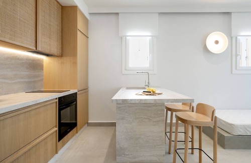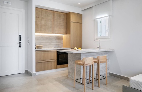 KYTHNOS BLUE - Suite 3 accommodates 1 double bed, 2 built-in single beds, a bathroom with a shower and includes a well-equipped kitchen with cooking hob and oven, providing extra comfort and convenience for families or guests wishing to prepare their own meals. It is fully air conditioned with hot water 24 hours and a balcony overlooking the marina of Loutra.