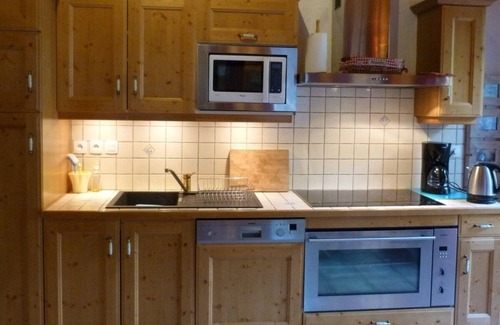 Well-equipped kitchen alcove with induction hob, oven, micro-wave, dishwasher, fridge/freezer, kettle, toaster and coffee machine