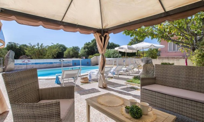 Very beautiful, comfortable residence "L'Oasi Del borgo". 8 apartments in the property. In the centre of Trinita' D'Agultu, in a quiet, sunny position in the residential district, 6 km from the sea. For shared use: lawn, beautiful garden to relax, swimming pool (5 x 8 m, 140 m2, seasonal availability: 01.Jun. - 15.Oct.). Outdoor shower, pergola, garden furniture, barbecue. In the house: washing machine (for shared use). Motor access to the house. Parking on the premises. Shop 350 m, supermarket 200 m, restaurant 350 m, bar 250 m, 2 minute walk to the centre, bus stop 500 m, sandy beach "la Marinedda e Isola Rossa" 6 km, diving center 6.5 km. Nearby attractions: Costa Paradiso 17 km, Santa Teresa di Gallura 46 km, Olbia 50 km, Porto Torres 54 km, Alghero 69 km. Please note: car recommended.