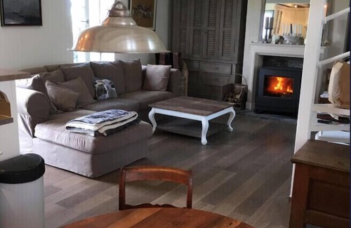 The house features a bright, spacious living room with a cozy corner sofa, an insert fireplace for warm evenings, and a welcoming dining area. The fully equipped kitchen includes a central island, new dishwasher, fridge and freezer, and all the necessary utensils.