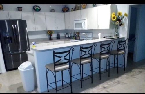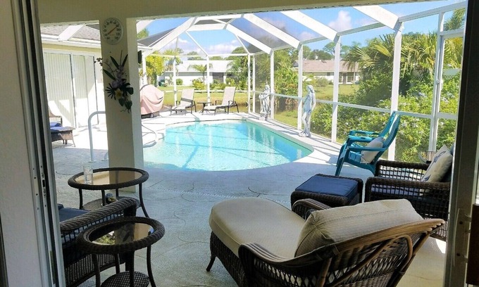 Experience the luxuriant tropical foliage as you enter this open concept home with sliding pocket doors opening directly to beautiful pool to allow for maximum outdoor living. You will be mesmerized by the fresh water canal, lovely sounds of nature and abundant vegetation. 5 rooms open to this private pool.This home has volume ceilings, huge well equipped kitchen open to great room. The well equipped kitchen has a pantry, large refrigerator with front ice maker, microwave, dishwasher and stove. There is a snack bar with stools. The great room is huge and is open to the kitchen to allow for visitation with guests as you are preparing snacks. There is a brand new entertainment center with 50 " TV and DVD player. There is surround sound for your enjoyment, as well as a boombox for easy listening. The couch, love seat and lazy boy allow for comfortable relaxing. Cable TV and internet are supplied.The master has a king bed, dresser with mirror, desk, large screen TV, and walk in closet, private bath with roman shower with rain tree shower head, double sinks, separate room for the toilet, love seat under oval window. Wake up to the view of the lovely pool.