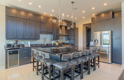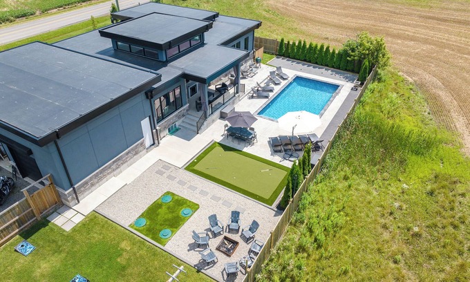NEW large modern spacious bungalow offers 5 bedrooms 3.5 bathrooms private retreat with heated in-ground pool, putting green, bocci court, theatre room, gas bbq, fire pit, fire place and more. We welcome large groups and families