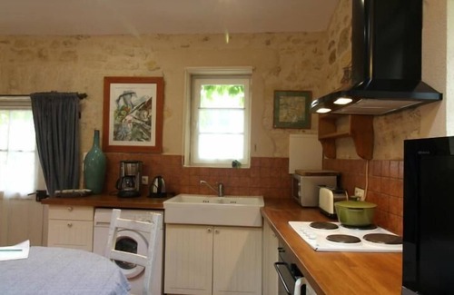 This charming renovated 18th century barn with stone walls and oak beams hides in a hamlet, next to owners'house, and has the use of an enclosed garden and barbecue to share. Private terrace and walking paths near by. Tennis table, children games. Domestic animals accepted with deposit (150 €). Internet access. Spacious open space living room : kitchen area with microwave, dining area, lounge with double sofa bed, bedroom space with queensize bed, wood burning stove. Shower room with italian shower/wc. Extra child's bed available. Tasteful decoration. Electrical heating. House linen included. House cleaning and logs in option. St Emilion is 11 km away.
