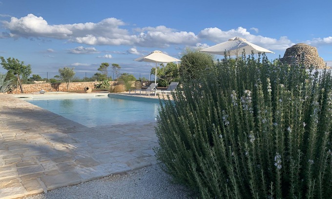 "La Janca" has a wonderful design pool, for common use, 50 sqm large. and panoramic view of the surrounding countryside, dotted with the typical trulli called "Pajare", of pines, olive trees and the typical Mediterranean vegetation, with elegant furnishings in order to comfortably enjoy the sun, the colors and scents of the enchanting Salento and a refreshing outdoor shower perfect for relaxing and having fun in total privacy.