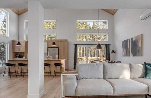 Discover La Leonessa, a spacious chalet nestled in the heart of the forest in Shannon, Quebec. Designed to accommodate up to 14 guests, this retreat features 4 comfortable bedrooms and 2 modern bathrooms. The bright living room, with its cathedral ceiling and large windows, invites relaxation while offering breathtaking views of the surrounding nature. The fully equipped kitchen and dining area are perfect for sharing warm, convivial meals.