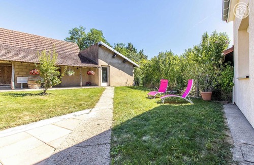Farmers now retired, whose nearby farm you can visit which still welcomes many animals for the enjoyment of children (horses, donkeys, geese, chickens, ducks, rabbits, etc.), Évelyne & Michel welcome you in a old country farmhouse dating from the end of the 19th century, now fully restored & revamped into a comfortable contemporary holiday resort. Absolute calm, in the heart of a peaceful little residential hamlet nestled in the countryside 2.5 km from the center of the charming typical Bressan village of Simard. In the hollow of a relaxing rural & agricultural setting preserved on the immediate edge of vast fields, rivers & meadows, a stone's throw from a bucolic little private, intimate & wooded pond, protected from view by a small wood, with a sheltered room fitted out with summer kitchen, perfect little "spot" for any fishing enthusiast or for basking & lounging in a privileged natural setting. Restful green site & ultra rejuvenating. Spacious gîte with good comfort. Lovely contemporary country style with a "rustic chic" spirit. Warm, soft and exotic atmosphere of an old house. Spacious exposed & shaded terrace opening onto a pleasant enclosed garden furnished and flowered with care, with the historic outbuildings of the farm including a large sheltered passageway terrace (and a bicycle room) as well as a gravel courtyard (potential for pétanque natural!). Beautiful open view over the surrounding countryside. Composition: Village house adjoining another house (total independence without vis-à-vis). Wireless. Oil central heating. Single storey cottage: kitchen, living room, 2 bedrooms (double bed 140x190cm / 2 single beds 90x190cm), bathroom (shower + bath), separate WC (2 descending steps to access the sanitary area) . Enclosed land (250m²) + terrace + parking + sheltered terrace + bike room. All private. Shops and services 6.5 km. TGV stations: Creusot 61 km, Mâcon 74 km.