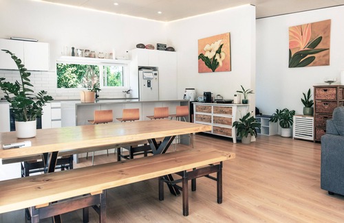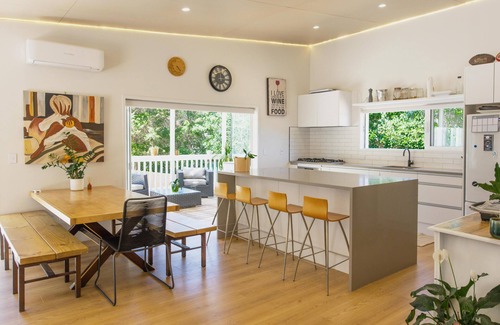 La Maison Soleil - Modern, sun-filled home with 4 bedrooms (2 kings including a stand-alone sleepout in the pool area, 2 queens) and 3 tiled bathrooms. Features a full kitchen, aircon, and open living flowing to a large garden with BBQ, heated swim s | Villa in Waiheke Island