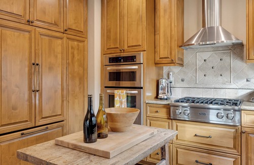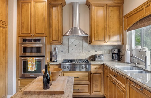 The interior welcomes you with separate living, kitchen, and dining areas that provide plenty of space to spread out and unwind. Kick back and relax in the comfortable living area. A large TV and provided board games set the scene for movie or game nights with loved ones. The fully equipped kitchen is every cook's dream, boasting gorgeous wooden cabinets, ample counter space, and stainless steel appliances. Whip up your favorite home-cooked meal, and gather around one of two dining tables.