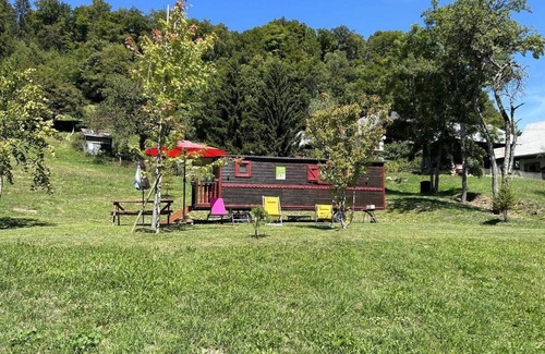 Vintage trailer that can comfortably accommodate 2 to 3 people. It has a kitchenette adjoining a relaxation area (table, sofa, television). A double bed + 1 sofa bed. A bathroom (shower) with dry toilets. Running water supplied from an uncontrolled source. Provision of mineral water bottles for consumption during the stay. Furnished terrace with mountain panorama. The Grand Prés caravan is nestled in lush greenery in a sunny and quiet hamlet on the edge of the forest. For a stay or a few days, Philippe and Marika will welcome you in this unusual accommodation and will be able to tell you - according to your desires - the sites to visit, the trails to walk around Albertville and in Savoie. Thanks to the outdoor space equipped with table and barbecue, you can enjoy the tranquility of the place and contemplate the mountains. An experience to be enjoyed as a duo or as a family!