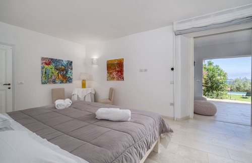 Enter the villa on the upper floor, where you will be welcomed by a light and airy sitting room adorned with modern art, with sliding floor-to-ceiling windows that open out onto a panoramic sea view balcony. The seating area has two comfy sofas, handy coffee tables, a satellite television, and a corner open-hearth fireplace for those cooler months and evenings. The blue and white tiled kitchen is fully equipped with all the appliances you will need to cater for your holiday, including an oven, hob, fridge freezer, microwave, and that must-have morning coffee maker. The adjacent eight-seater dining area is perfect for some smart indoor entertaining. The first of the five beautifully appointed bedrooms can be found on this floor, furnished with a king-size bed, walk-in closet, and an ensuite bathroom with shower, hand basin, bidet, and WC. A guest cloakroom and small storage space complete this level.