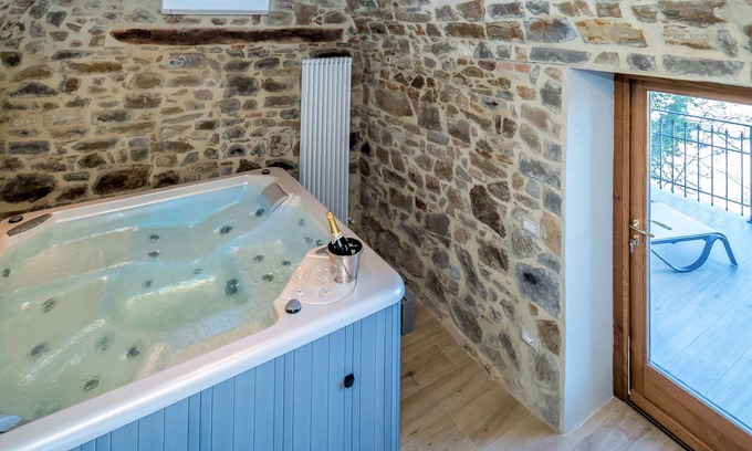 Seggiano 23 km from Montalcino: Very beautiful, cosy, comfortable house "La Suite del Benessere", renovated in 2019. In the centre of Seggiano 23 km from the centre of Montalcino, 65 km from the centre of Siena / Grosseto, in a central, elevated position on a slope, excellent location: right in the centre but still quiet. Private: small terraced garden, 25 m2 (fenced) with lawn. Shower/WC in the pool area, hot tub, terrace, barbecue. In the house: hot tub (all included), spa area. Parking at the house. Shop 500 m, grocery 500 m, supermarket 23 km, restaurant 50 m, bar 50 m, bakery 200 m, 1 minute walk to the centre. Nearby attractions: Monte Amiata 10 km, Bagno Vignoni 19 km, San Quirico d'Orcia 23 km. Please note: baby equipment (included). Object suitable for 2 adults + 2 children.