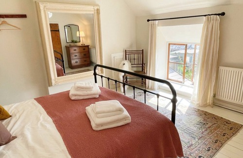On the first floor are two bedrooms: a large master bedroom with cast iron king-size bed and stunning views, and a smaller twin bedroom with a workspace, also with far-reaching views.