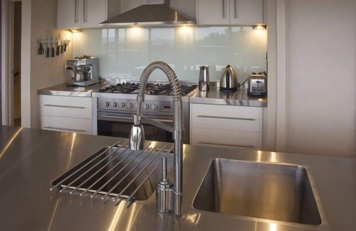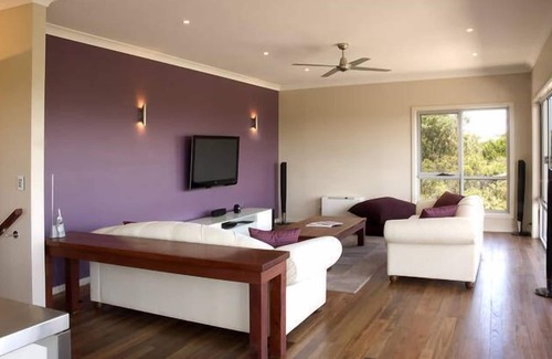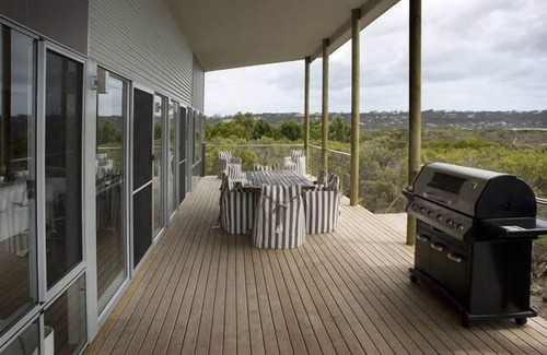Nestle in luxury amid treetops with breathtaking panoramic views of Eastern Cove encompassing American River, Ballast Head & Kangaroo Head. Lagoon House is a beautifully appointed contemporary beach house with stunning indoor & outdoor entertaining areas. Enjoy spectacular ocean & bushland views from the kitchen/dining/lounge. The house sleeps 8 in 4 generous bedrooms (2 Queen & 4 Singles) with 2 bathrooms. Both queen bedrooms have private decks with an ensuite bathroom in the master bedroom. Modern chef's kitchen features 4m stainless steel island bench, dishwasher & microwave. Covered outdoor deck with large roasting BBQ facility for informal meals. Outdoor shower & lots of room for boat parking.