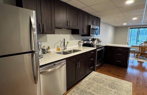 This spacious 1,350 sq. ft. basement suite offers comfort and style with a king-size bed and large walk-in closet in the bedroom. The living room features a pullout sofa bed, TV, and fireplace. You’ll enjoy a modern kitchen with quartz countertops, stainless steel appliances, a Keurig coffee maker with pods, and Starbucks creamer on hand. There’s also a dining area with seating for four and a full bathroom with tub and shower. A laundry room shared with your hosts is available for your use. Outside, relax on the deck with beautiful mountain views. There is also a BBQ with propane for your use.
