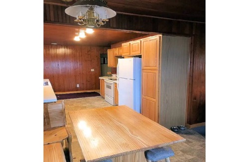 A lake front cabin with a large deck over looking the lake and private dock. The three bedroom with a full bed in each of the two bedrooms and twin bunkbed in the third bedroom. It has a large kitchen, spacious living room and a screened in front porch facing the lake. There is outdoor seating and fire pit with plenty of chairs. WIFI and TVs in each bedroom with satellite TV. Close to hiking trails and ATV trails.