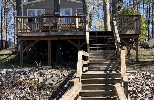Large lake front house with breathtaking view from shaded 2 tier deck, 3 stories with open kitchen, large living room, 3 bedrooms, 2 full baths, private boat dock, underneath storage for gear, outdoor shower for your use after enjoying the lake.