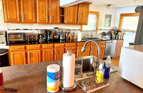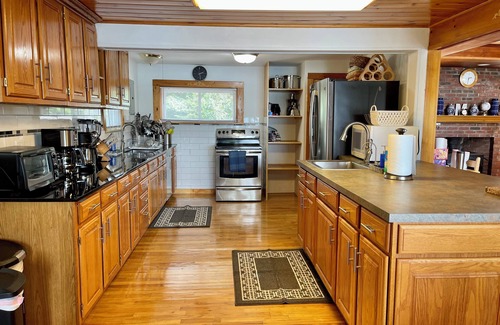 MODERN KITCHEN 2 SINKS CHILD ,PET AND HANDICAPPED FRIENDLY. BEAUTIFUL 100 YEAR OLD EVERGREENS AND OLD GROWTH TREES. NATURE TRAIL. STUNNING SUNSETS LARGE DOCK 30 ft by 15 ft. SHALLOW WARM WATER SWIM AREA GRADUALLY GOES DEEP. GAS BBQ . LARGE GLASS WINDOWS FACING SUNSETS SUPER NICE VIEWS. ALL MODERN APPLIANCES. STOVE OVEN AND 2 NEW REFRIGERATORS DISHWASHER ICEMAKER. AND FULLY STOCKED KITCHEN. 2 COFFEE MAKERS 1 KERING K CUP. Plus COFFE MACHINE . MIXER BLENDER FOOD PROCESSOR THE LIST GOES ON. LARGE WASHER AND DRYER.LARGE GAS BBQ GRILL.