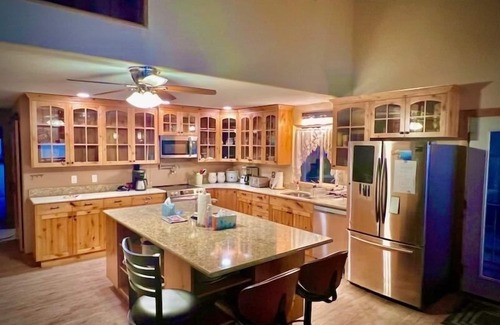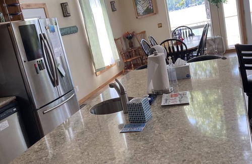 Please be considerate of the full time residents and keep the noise to a polite level. See beautiful sunsets over the water. Lounge on the deck just 24' from the lake. Let the kids play in the shallow, warm water area, directly in front of the house. Prepare your meals in the well equipped spacious kitchen. Enjoy the large island with a prep sink. . For the summer months, there are fans in all the rooms, Two window AC units: one in the kitchen window, one in the great room. Still, be prepared for the house to be warm/hot in the summer. There is a wheelchair ramp for entry with three foot doors throughout the downstairs. A seat in the downstairs shower, makes for easier access for a handicapped person. There are beds for 9. The carpeted loft has a futon and a 27 inch Smart TV. The great room also has a 27" smart TV. There is a carpeted game room with a ping pong table off of the loft. Bring your own fire stick to stream movies, we do furnish WiFi. Bring your boat, jet skis, kayaks etc. to enjoy at our 80 ft dock. The boat launch is 1 mile away on Farrs Ln. There is traffic noise since we are alongside Hwy 2. There are 2 kayaks with a few life-vests for use during your stay. Lake levels fluctuate from high to low. This is a natural lake, during the summer months, there may or may not be any exposed sand. The picture showing sand was taken later on in the year.The lake side of the lot is in a natural state. There will be grass and other natural growth along the lake bank.