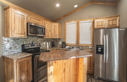 Come Stay in this beautiful lake front tiny home. It features 1 bedroom with a queen size bed, a full bath with a stand-up shower, and a pull-out sofa in the living area. It also offers a large open loft above the bedroom, where the kids can roll out the sleeping bags or just have a nice play area. This unit also has a fully equipped kitchen, outside grill, and fire pit. This home is surrounded by National Forest and is steps from the water.
