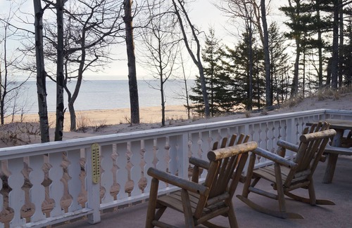 The Sunset House is nestled in the sand dunes of Great Sand Bay, the house derives some of its power from solar panels. Go to bed and wake up to the peaceful sound of the waves hitting the beach. You will enjoy the spectacular views of Lake Superior sunsets (always different) in the evenings and later at times the Northern Lights. For the early riser a walk down on the beach you can also see the sunrise to the right or east. First floor of the Sunset House is a large carpeted living area and game room with Satellite TV with hundreds of channels, Ping Pong Table, Air Hockey Table, Hockey Foosball table, Dart Board and Stereo system. There is also a spare Refrigerator Freezer for extra groceries. The main floor Has a monster Fully Furnished kitchen with everything you need to prepare and serve most any meal. There is also a washer & dryer, dining room, full bathroom with shower and bath tub, fully furnished carpeted King Bedroom, Carpeted entertainment Room with 60" plasma TV with 100's of channels a DVR, VCR with hundreds of movies games, toys and puzzles. Very comfortable Lazy Boy full size sofa sleeper. Carpeted living room with Lazy Boy rockers and recliners full size pull out Futon, Library area with many history books about the area and many other book topics. Upstairs 2 fully carpeted fully furnished King Bedrooms one with walk out Glass balcony with table and seating for 2 over looking the beach and Lake Superior. Full Bathroom with shower upstairs. Huge Deck with Log and Wood Furniture Large Picnic table 1 gas grill and 1 charcoal grill. Enjoy the Sunsets, fires on the beach in the fire pit, Northern lights, or get up early and enjoy the sunrise on the 2 person swing with table or the other wooden beach furniture on the sand dunes overlooking Lake Superior.