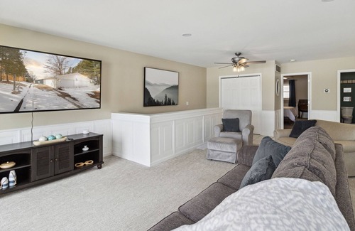 Cozy and spacious living room with comfortable couch to curl up for a movie with your loved ones and plenty of board games to keep you entertained. The living room offers plenty of natural light and flows seamlessly together, creating a warm and inviting space perfect for bonding with friends and family. Pool table also available to play with friends/family.