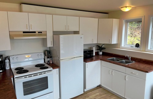 You will have the entire lower suite, with private entrance, of a top down duplex overlooking the lake. The lower suite is a daylight basement with big bright windows all along the lake facing side. The suite is suited for a maximum of four adults (families with 2 adults and 3 children have also made it work), with a queen bed in the bedroom and a queen sized sofa bed in the living room. There is a two-piece bathroom as well as a laundry room where the shower is located. The kitchen is spacious, fully equipped and has a large dining table that doubles as a workspace with a great lake view.