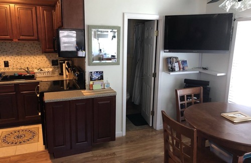 There are two small bedrooms, one with a Queen bed and another with two twin beds. Each bedroom offers some underbed storage as well as a small dresser. Each bedroom features Smart TV technology so you can access your own streaming services. The kitchen area and living room area combine for openness and cozy seating. In the living room area there is another Smart TV and a DVD player. A dining area with a high-top table offers casual indoor seating for up to four. Our small bathroom has a tub/shower combo. A quiet and comfortable mini-split A/C unit will cool the entire space for your comfort and 5G WiFi is also available throughout to help you stay connected when liquid sunshine makes an appearance. At 540 sq. ft., our cottage is ideal for small families or for couples who are looking for a casual place to use to enjoy water based activities that's close to the action of Weirs Beach.