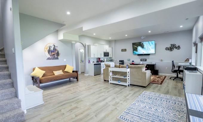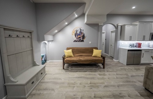 The Wolf’s Den is completely separate from the upper levels of the house. The main den, office area, dining area, kitchenette, bedroom, and bathroom are all private!