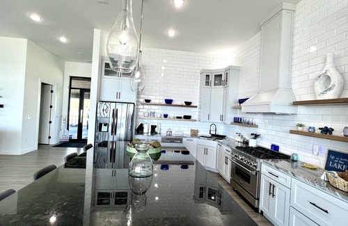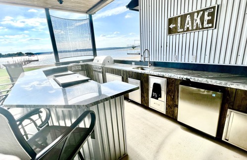 Modern Kitchen: Prepare gourmet meals in the fully equipped kitchen, featuring stainless steel appliances, gas cooktop, granite countertops, and a large center island. Share meals with loved ones at our large dining table with ten barstools to choose from all the while taking in the scenery of the lake.