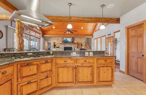 Relax and unwind at this quintessential lake getaway. The rustic log-style home sits on over an acre offering more privacy and almost 300 feet of lake frontage with a natural beach. With room to sleep 21, a large family or multiple groups of family and friends can be accommodated. The great room is enhanced with rough log pillars and wood finishes and boasts a magnificent natural stone fireplace and 2 story vaulted ceiling with a wall of windows to take in the gorgeous view of the lake. Large sliding doors open to two levels of spacious decks offering more room for relaxing, dining and entertaining. The master suite with deck access and private bath with large tiled walk-in shower is on the main level, while the upper level has 2 large guest rooms. This magnificent cabin also includes a vast living/recreation/bar room on the lower level along with 3 more bedrooms, 2 of which are large bunkrooms that sleep 6 each.