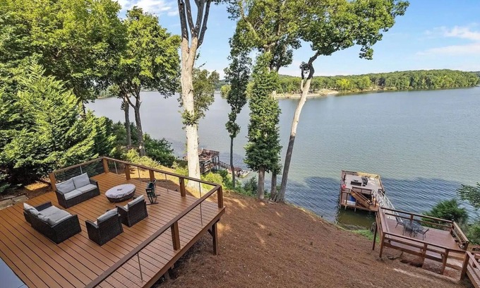 Welcome to your Lake Wylie retreat! This 3BR/3.5BA waterfront lodge features sweeping 180° main channel views, a private two-story dock with deep water access, a regulation pickleball court (convertible to half-court basketball), two fire pits, multiple decks with tons of hangout space, and a spa hot tub for evenings under the stars. With over 3,200 sq ft of interior living space, three lakefront bedrooms, decks with jaw-dropping views, and a cozy front porch with rocking chairs, this home is designed for both relaxation and fun. Located just 20 minutes from Charlotte Douglas International Airport, Uptown Charlotte, Bank of America Stadium, and Carowinds, it’s the perfect city escape — close to everything yet worlds away. Skip the traffic jams of Highway 49 heading into South Carolina or the bottlenecks toward Lake Norman; here you’ll enjoy quick access to the city while still feeling completely secluded on a quiet cul-de-sac.