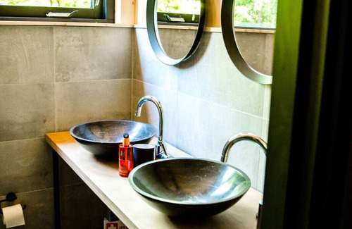 The nature house has its own private terrace, seamlessly connecting indoor and outdoor living. With a beautiful dining table and comfortable chairs, it’s the ideal spot to relax and enjoy the natural surroundings.