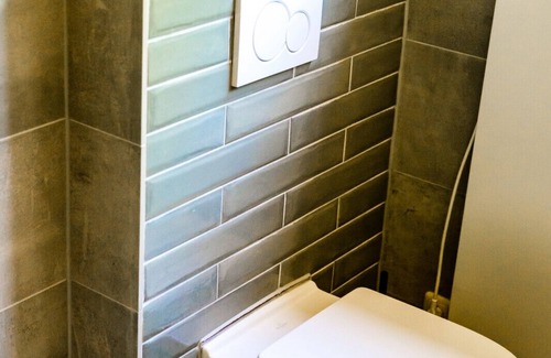 The luxurious bathroom includes a shower, toilet, and sink, offering all the privacy and comfort you need during your stay. Each guest is provided with two plush bath towels.