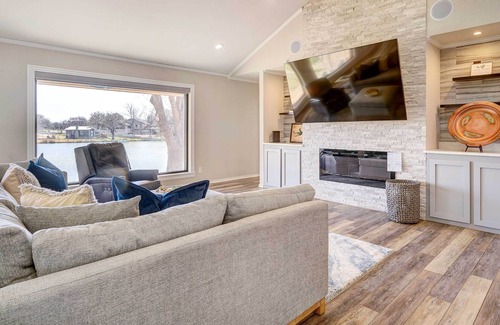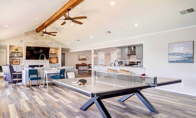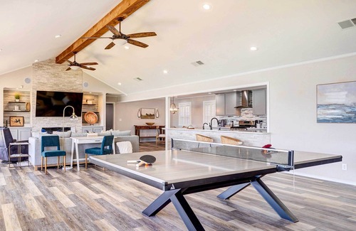 This spacious, luxe vacation rental elevates your Lake Nasworthy escape in San Angelo, TX. Boasting designer furnishings, ample amenities, and a serene setting, this 2-bedroom, 2.5-bath home optimizes your relaxation. Enjoy a blissful coffee moment on the patio, followed by a day of fishing, swimming, and exploring attractions like Fort Concho. When the sun begins to dip, show off your culinary skills back in the full kitchen, watch a movie by the fireplace, and compete in ping pong or poker!