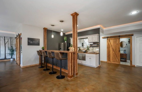 The driveway is shared with another rental property, please park in the parking space by the retreat. The top of the driveway can accommodate all of your vehicles for your stay.