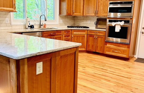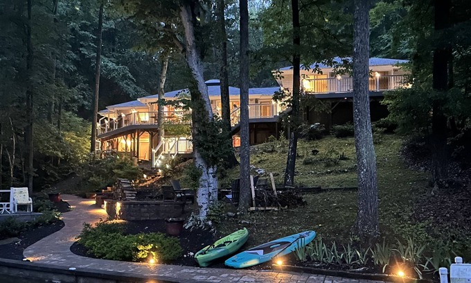 Serenity is surrounded by mature trees with spectacular color. located in a quiet, safe cove with main lake views only 15 minutes from food and specialty shopping by car and 10 minutes to lakeside amenities, restaurants, etc. and gas by boat. large screen smart TVs. Also an indoor fireplace and outdoor fire pit (wood is provided.) Swimming is safe and enjoyable in 10 feet of water at the end of the boathouse deck in a no wake zone. Guests are provided with floating chairs, water toys, life vests, a paddle board and kayaks; Decking with table and chairs are conveniently located next to the boathouse and are accessed by stunning, lighted rock and stone walkways. You feel absolutely secluded as the other homes are tucked out of sight among the trees.