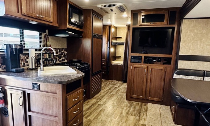Come stay at Buffalo Springs lake in a “Roomy RV That Won’t Break the Bank!” This RV will comfortably sleep 4-6 and has all the amenities of home. Some perks include, a small bathtub (if you have infants, toddlers, or small pets) an outdoor shower if you need to rinse off after a swim in the lake.