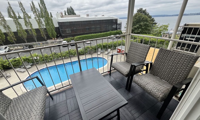 Best location in the Kirkland Waterfront just off Lake Street. Lake Washington and pool views from living room and large patio deck. Popular building features elevator access, secure lobby entrance, reserved parking and pool open from May to October (weather permitting)