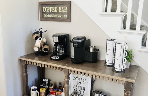 The kitchen is fully stocked including pots and pans of all sizes. COFFEE Bar: Drip coffee maker Keurig K-CAFE with frother for lattes, French Press and kettle for tea. Various creamers and syrups! Barbeque ready with propane grill and extra propane tank in the garage.