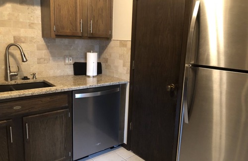 Kitchen will exceed all expectations. Appliances were purchased as new Whirlpool Stainless Steel. Dishwasher has stainless interior with noise level under 50db. Brita Stream water pitcher provided in fridge. Please do not reset Brita electronic filter counter; just use and refill. Microwave and range oven have convection capabilities and more features than can be listed. Easy clean glass cooktop. Electronic control can be programmed for Spanish/French in addition to default English. Please do not use self-clean oven feature. Manufacturer recommends using that feature sparingly. Counter tops are granite, backsplash is travertine, sink is composite granite with stainless Moen touchless faucet. Rice cooker. 4 slice toaster. Dishware place setting for four. Cloth napkins for special eat in meals.
