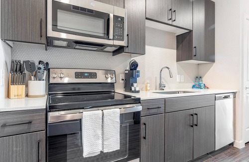 Indulge in luxury at Lyric at the Merc in San Antonio, TX. Our prime location on the Northwest side of the city places you near top dining, shopping, cultural hotspots, and scenic hill country escapes, offering the best of both urban living and natural beauty. Inside your fully-furnished apartment, you'll find everything you need for a seamless stay: a complete kitchen, generous closet space, and a laundry room with a washer and dryer.