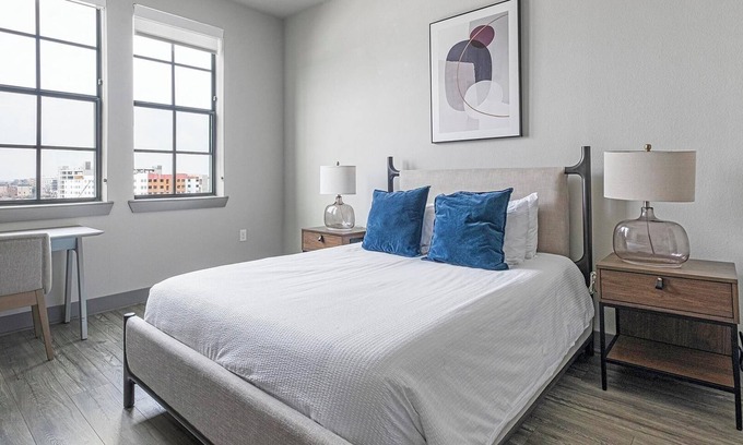 Bellrock Sawyer Yards in Houston, TX offers luxury apartments in a prime location. Each spacious home features high-end finishes, stylish furnishings, modern kitchens, and in-unit laundry for ultimate comfort. Enjoy resort-style amenities including a pool, state-of-the-art fitness center, coworking space, rooftop deck, and a community dog park for your furry friend. Experience the perfect blend of upscale living with flexible terms, ideal for stays of any length.